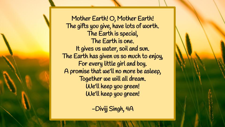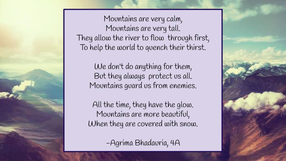 It makes us immensely proud to see our Grade 4 students compose poems, and that too on the beauty of Nature. Their sensitivity and appreciation of Nature is clearly evident through these poems. Writing and reciting poems helps enhance their imagination as well as their oratory skills, and enables a deeper understanding of the language.