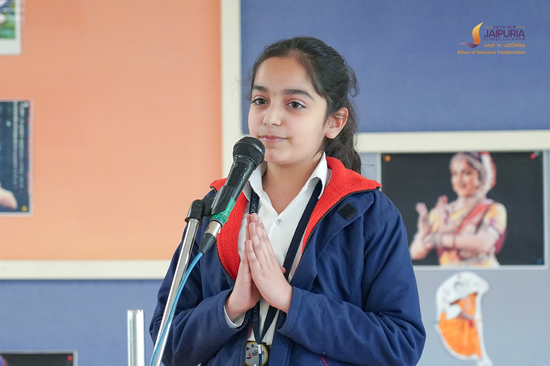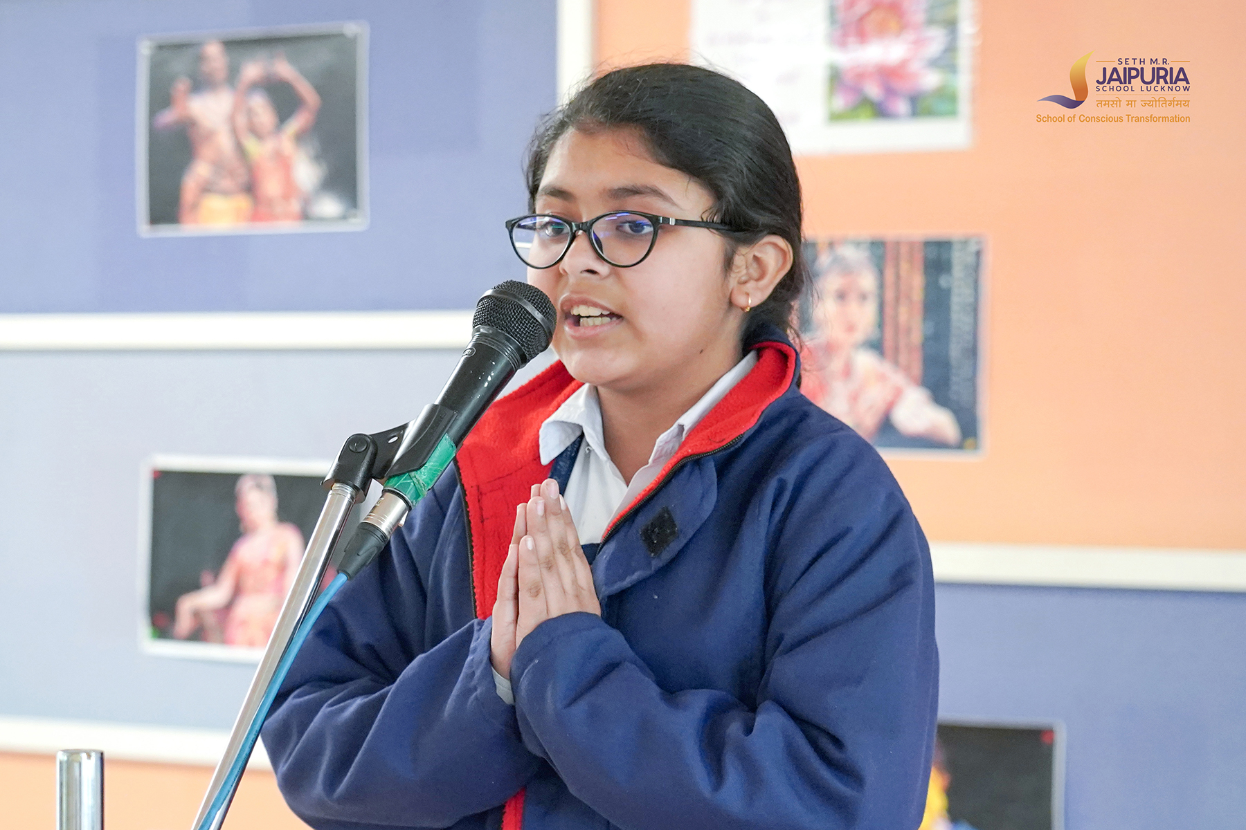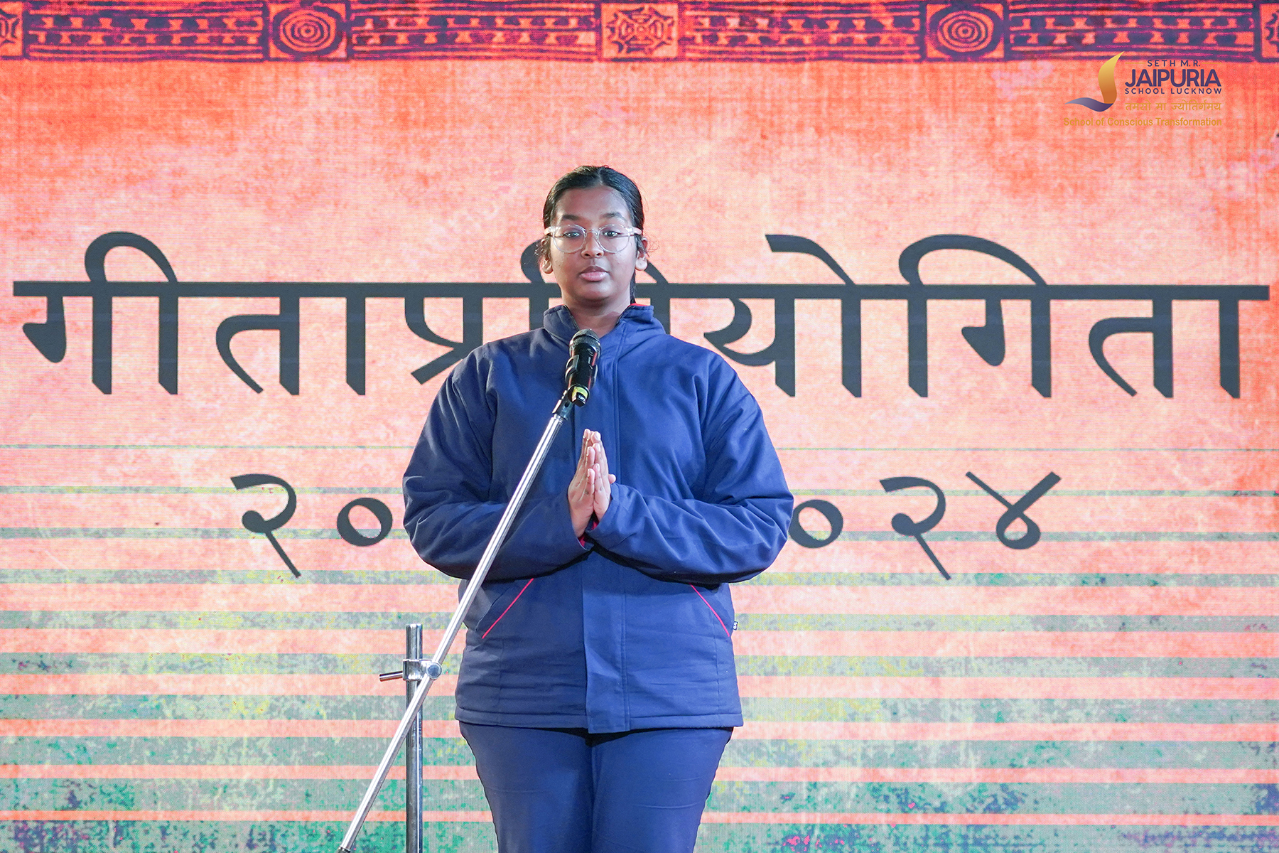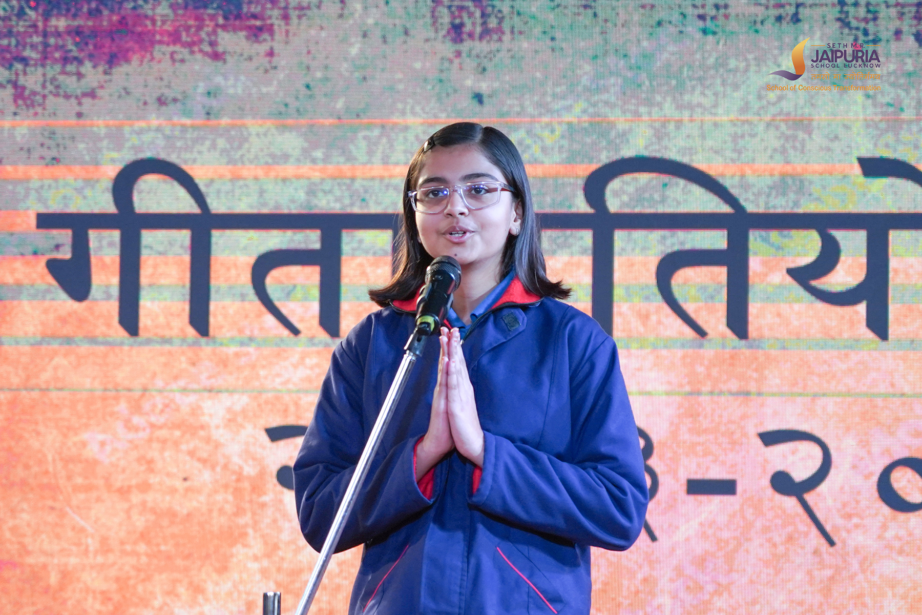 From 8th to 17th February, four Gita recital competitions, also known as Geeta Pratiyogita, were held at Seth M.R. Jaipuria School. Students from classes 5th to 8th participated with great enthusiasm. Recitations from the 3rd Adhyaya of the Bhagavad Gita filled the atmosphere of the school auditorium with divine bliss.