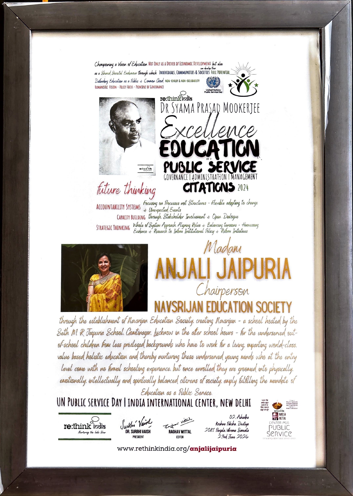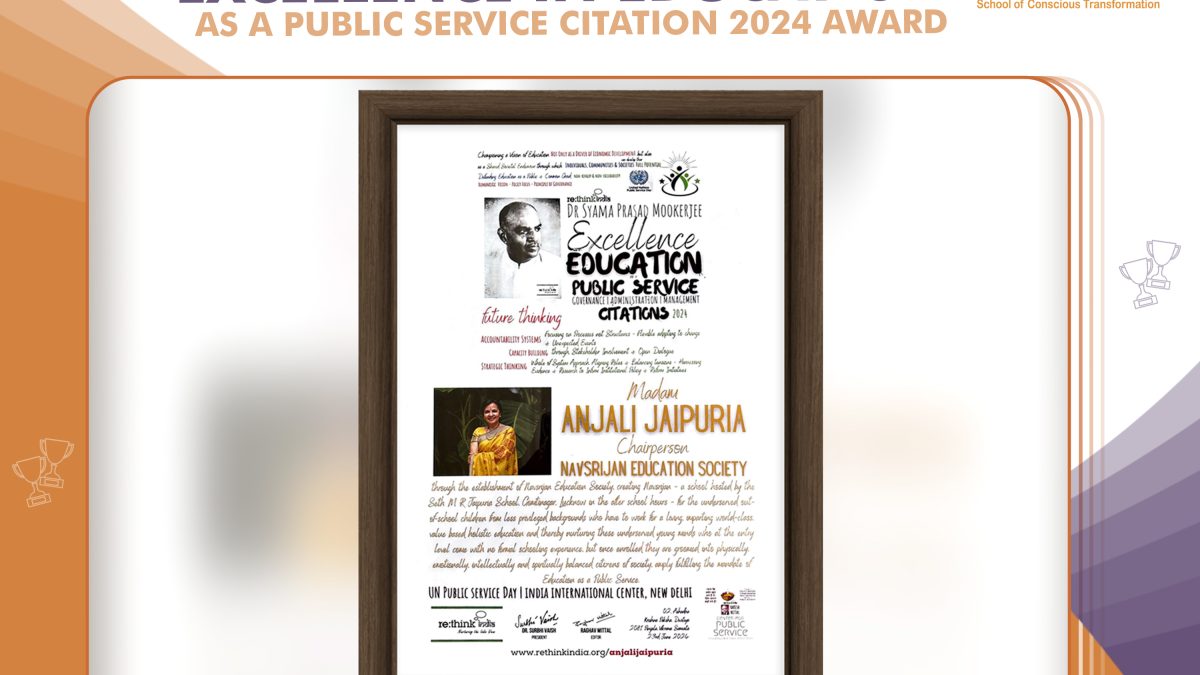 We are proud to announce that on 23rd June 2024 our Chairperson, Mrs. Anjali Jaipuria, was honored with Dr. Syama Prasad Mookerjee Excellence in Education as a Public Service Citation 2024 Award. Anjali Ma’am was bestowed with this prestigious award in recognition of her exceptional contributions to the education of the underserved. Anjali Ma’am is deeply committed to raising universal consciousness. Through NavSrijan, she aims to consciously transform students’ spiritual being, physical being, vital being, mental being and psychic being. She inculcates the spiritual values of The Mother and Sri Aurobindo in education.