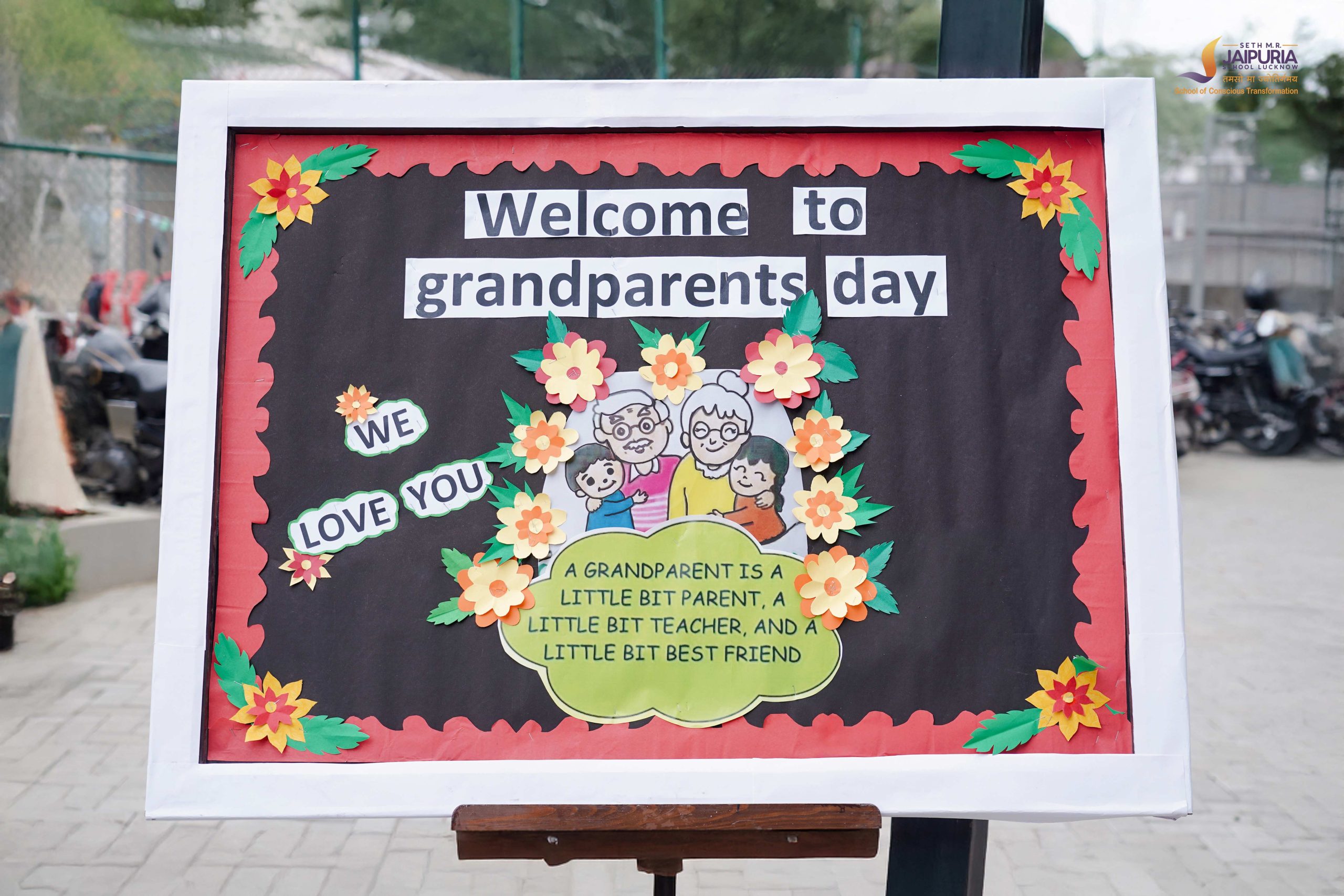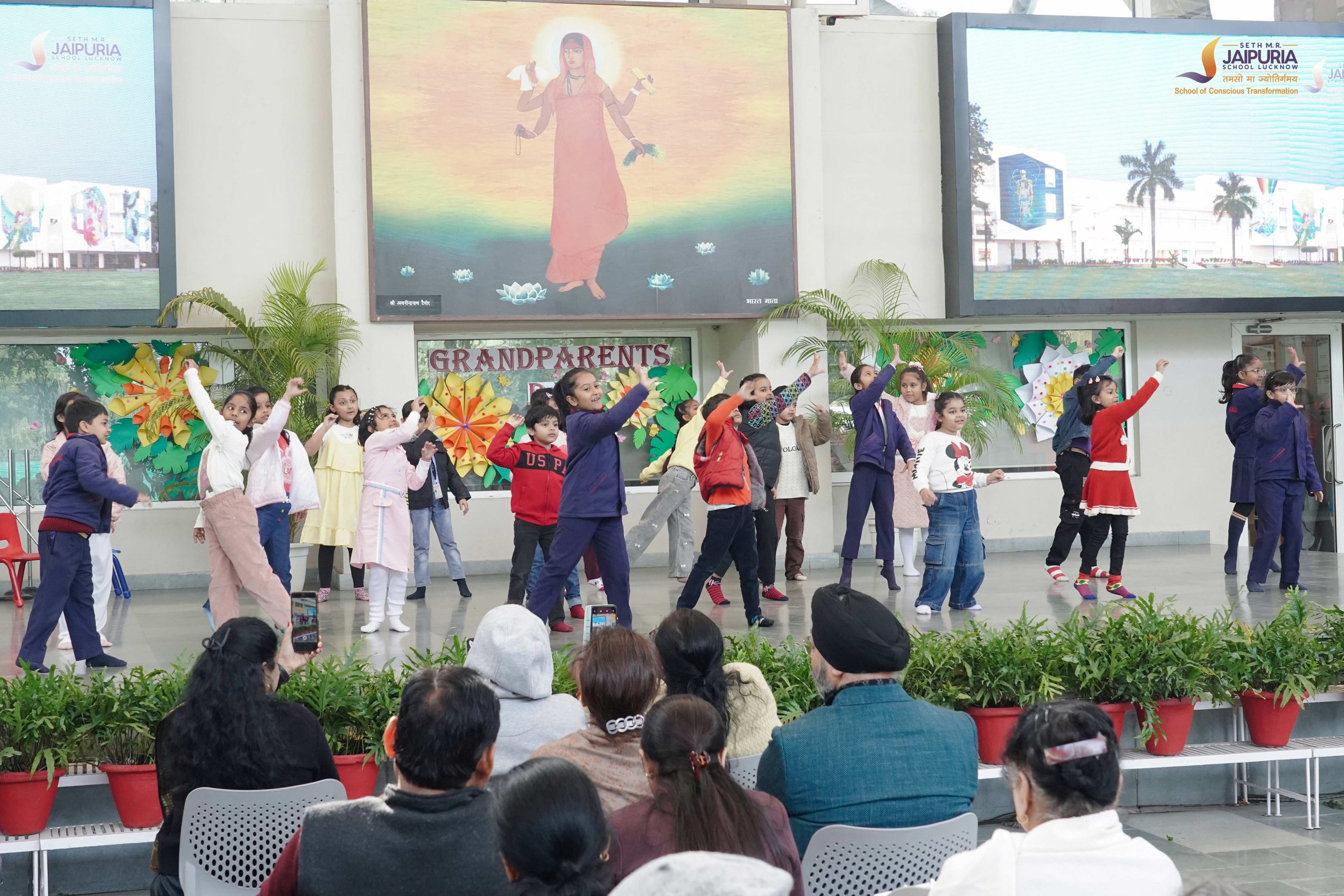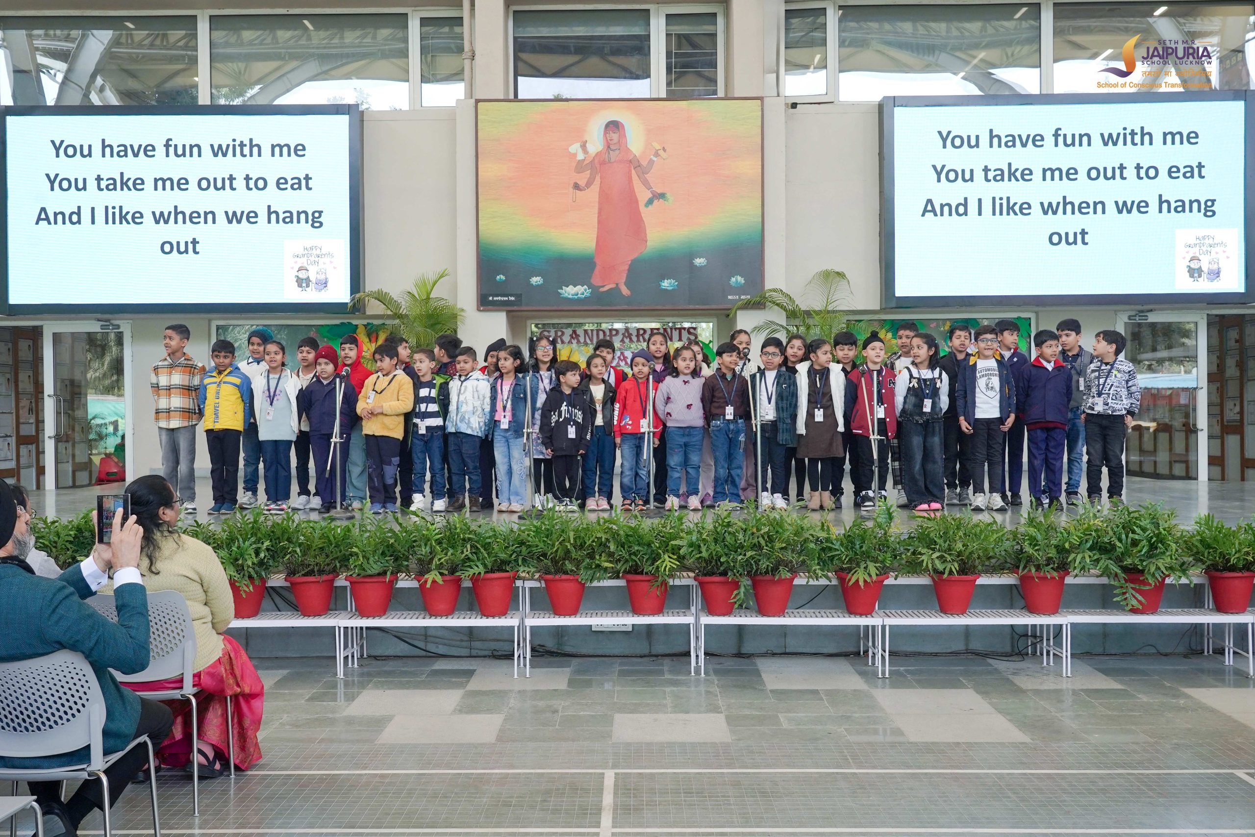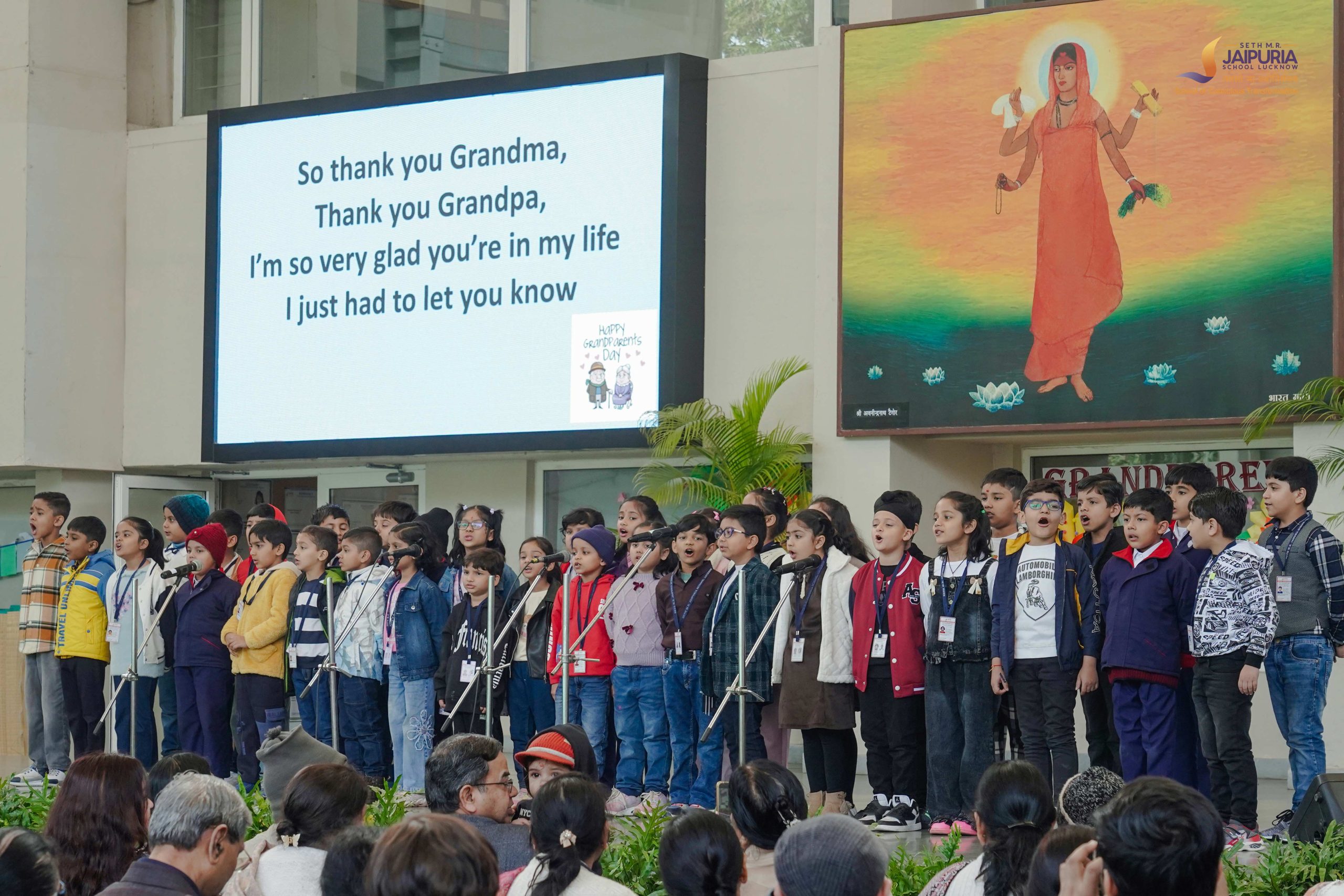 Once the activities wrapped up, everyone moved to the beautifully decorated assembly area. Soft music filled the air as grandparents settled down, surrounded by thoughtful décor and gratitude-filled quotes displayed across the walls. Messages like “Thank you for filling my childhood with beautiful memories, wisdom, and love” and “Grandparents make the world a kinder place just by being in it” added depth and emotion to the space.