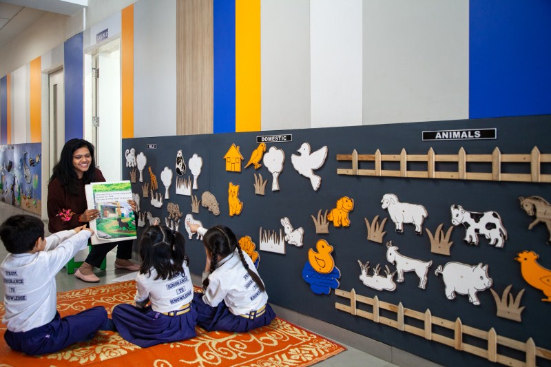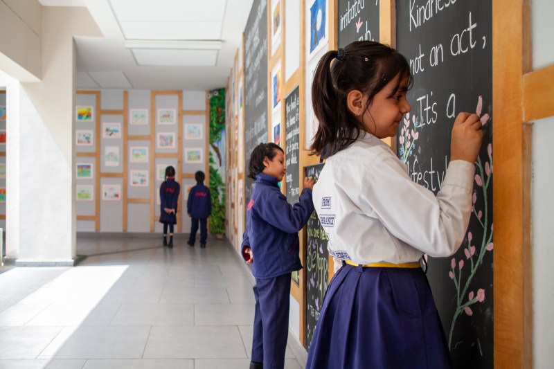 This part of the school building and its spaces have been decorated and furnished in a way so as to provide a wide-ranging stimulus to children to explore and learn through play. The school has a state of the art pre-primary block for children between the age group of 3.5 – 6 years in Kindergarten classes. To make learning an enjoyable experience, the classrooms, play areas, outdoor areas have all been provided and installed with bright and colourful play and engaging material that appeal to the children. Smart classrooms, individual cubby-holes, art trolleys and a wide range of class material make learning fun.